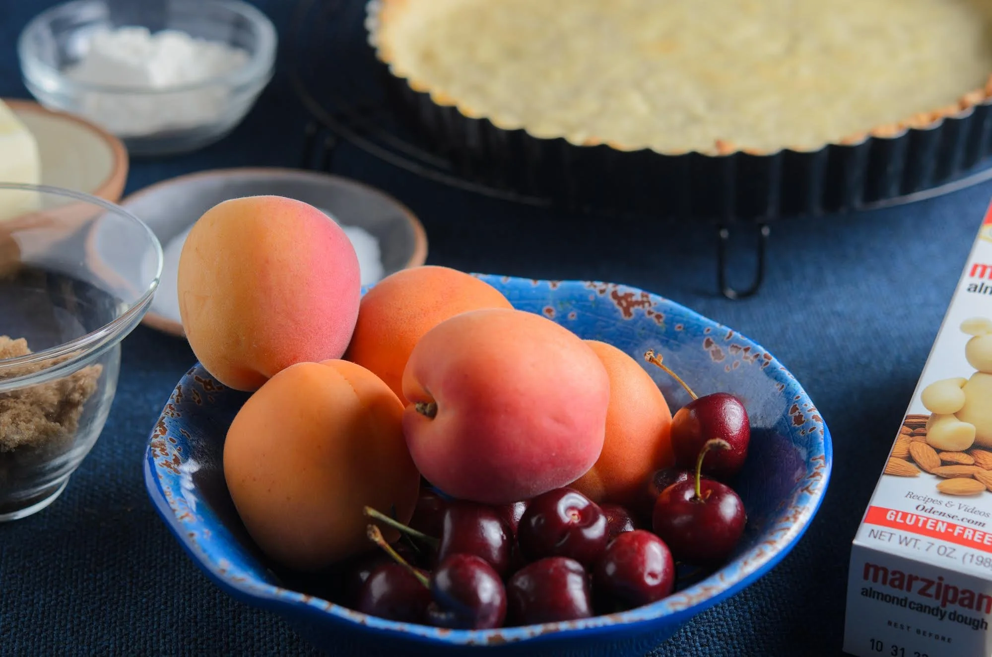Also, the recipe calls for marzipan in the topping. You can substitute almond paste, which you can purchase online or next to the marzipan in the baking section of your grocery store. Marzipan is slightly sweeter than almond paste, which has a grainier texture, but don’t leave it out because it adds a lot of punch. My husband, who is not a fan of marzipan, loves this tart. The slight tartness of the apricots with the sweet cherries is a great combination; later in the summer you could substitute peaches and raspberries. I love this dessert so much that I buy enough fruit for a couple tarts, halve them, pit them, and freeze them for another tart later in the year.Serves 8 Adapted from David Lebovitz