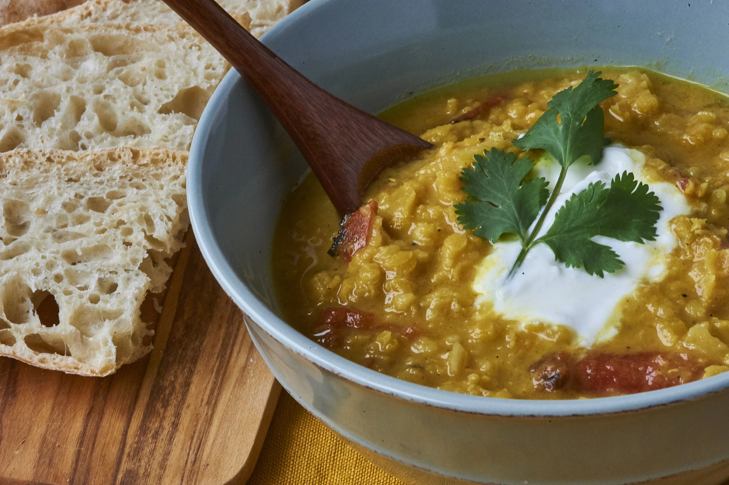 Andy Warhol’s iconic painting of Campbell’s Tomato Soup can is the one most of us remember, but he actually painted 32 different varieties of soup. Apparently he liked soup—no surprise there. Who doesn’t like soup? It is comfort food on a cold day or when you are feeling under the weather. It is a convenience food for a quick lunch, or when you are feeding a crowd. Since it is now finally sweater weather, get out the soup pot and make some—the varieties are endless so it can be hard to decide which one to make. With a hunk of bread and a salad, soup is a complete meal. One of my new favorite soups is Curried Lentil Lime soup. This can be a vegetarian soup if you use vegetable broth or water instead of the chicken broth and if you skip the dollop of yogurt it is also vegan. Hearty and healthy, this is simply delicious and surprisingly quick to make. The grated apple gives the soup a subtle layer of sweetness while the fire-roasted tomatoes provide more depth and a chunky texture. I use canned roasted tomatoes, but you can use whatever you have on hand. Many people have strong opinions about cilantro, so start with the smaller amount and add more if needed or just pass it around at the table.